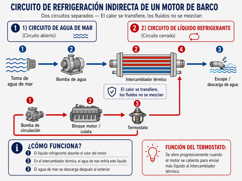 El circuito interno contiene el líquido refrigerante que circula dentro del motor. El circuito externo utiliza el agua exterior, a menudo de mar, que atraviesa el intercambiador para llevar el calor hacia el exterior. Esta separación es una de las grandes ventajas de la refrigeración indirecta, ya que limita la exposición directa del motor al agua salada.