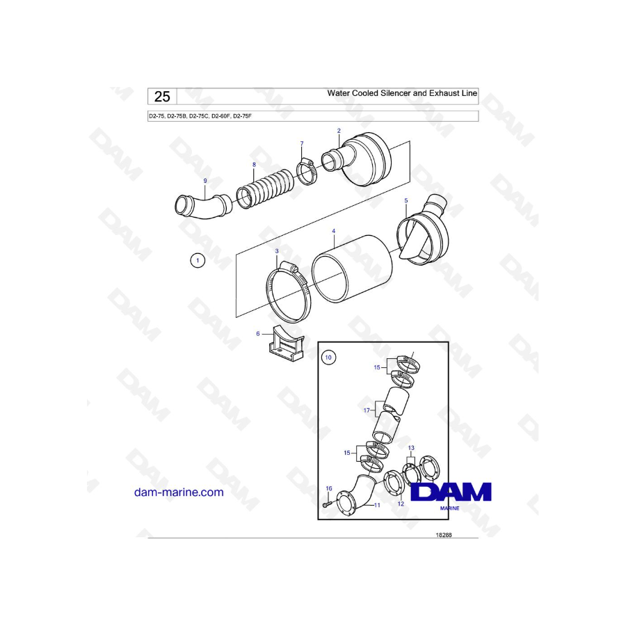 Volvo Penta D2-75 / D2-75B / D2-75C / D2-60F / D2-75F - Silenciador y línea de escape refrigerados por agua
