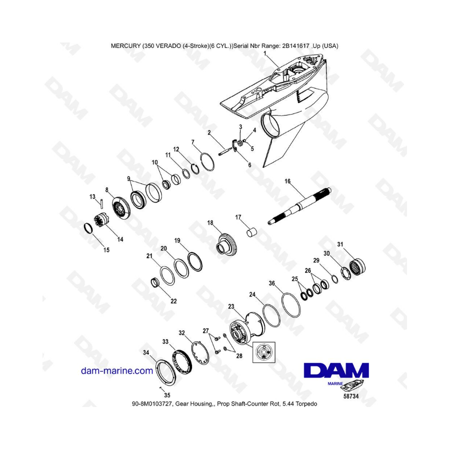 Mercury 350 Verado (6 CIL.): Caja de engranajes, Eje de hélice-contrarrotación, Torpedo 5.44