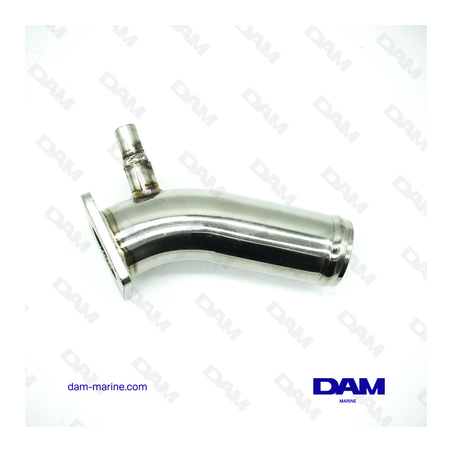 Coude d'échappement en inox pour moteur PERKINS 4108 avec piquage d'eau sur la partie avant du coude ( prés de la durite d'échappement ) permettant de positionner la pipe d'eau vers le haut pour les moteurs disposant du montage Bowman.