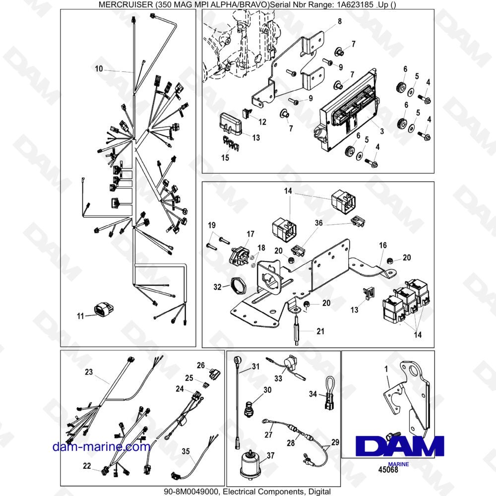 Vue éclatée : COMPOSANTS ÉLECTRIQUES, MÉCANIQUES pour moteur MERCRUISER 350 MAG MPI.