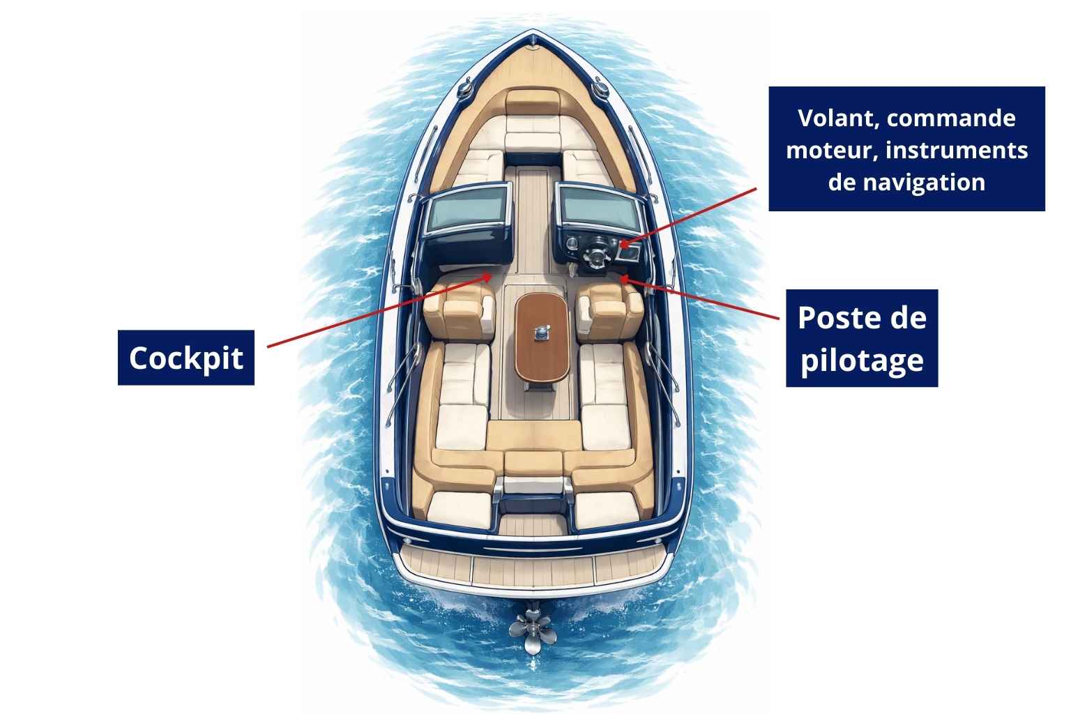 Le cockpit est la zone centrale où l’équipage s’installe. On y trouve généralement les banquettes, la table et l’accès au poste de pilotage. Le poste de pilotage comprend le volant ou la barre, les commandes moteur et les instruments de navigation.