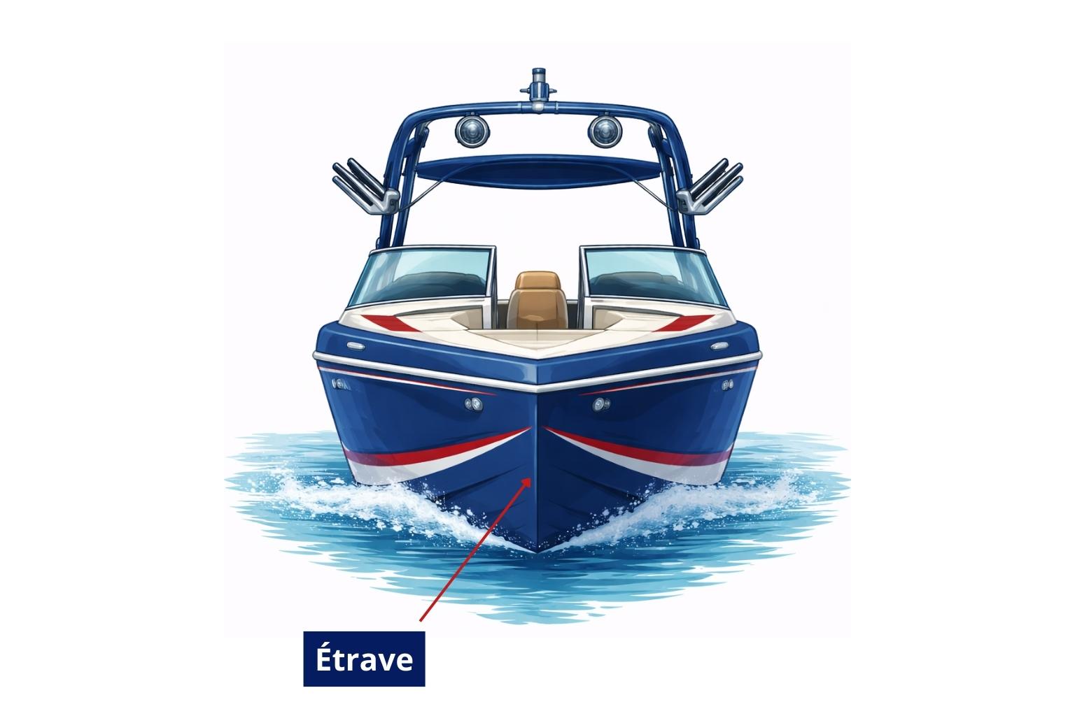 - Avant / arrière : étrave, brion, tableau arrière, plateforme de bain