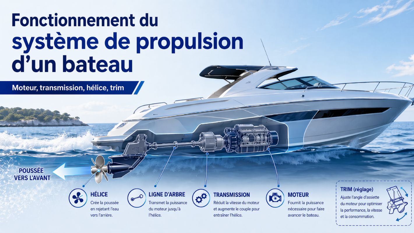 Vous souhaitez comprendre comment votre bateau avance réellement, ce que font l’hélice, l’embase, la ligne d’arbre ou le trim, et pourquoi certaines pièces ont un impact direct sur la poussée, la stabilité et la consommation ? La propulsion d’un bateau ne se résume pas au moteur seul. C’est tout un ensemble mécanique qui transforme l’énergie du moteur en mouvement dans l’eau. Bien comprendre cette chaîne permet de mieux entretenir son bateau, de choisir les bonnes pièces et d’identifier plus vite les symptômes lorsqu’un comportement anormal apparaît en navigation.