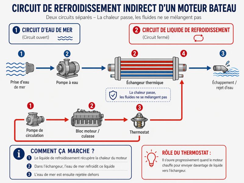 Schéma comparatif : circuit direct = eau extérieure dans le moteur ; circuit indirect = liquide de refroidissement dans le moteur + eau extérieure dans l’échangeur.