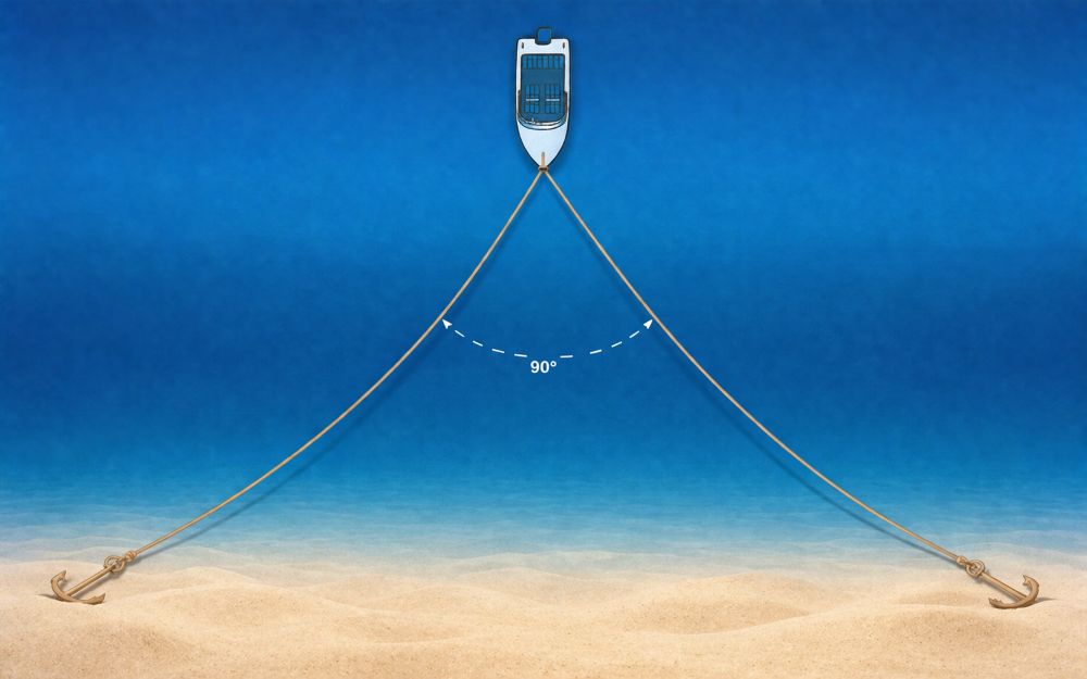 It is not the simplest method for a beginner, but it can be useful when you want to reinforce the anchoring setup without going as far as a full forked anchoring arrangement. Above all, it requires good management of the anchor line and the order of manoeuvres, otherwise recovering the anchor can become more complicated.