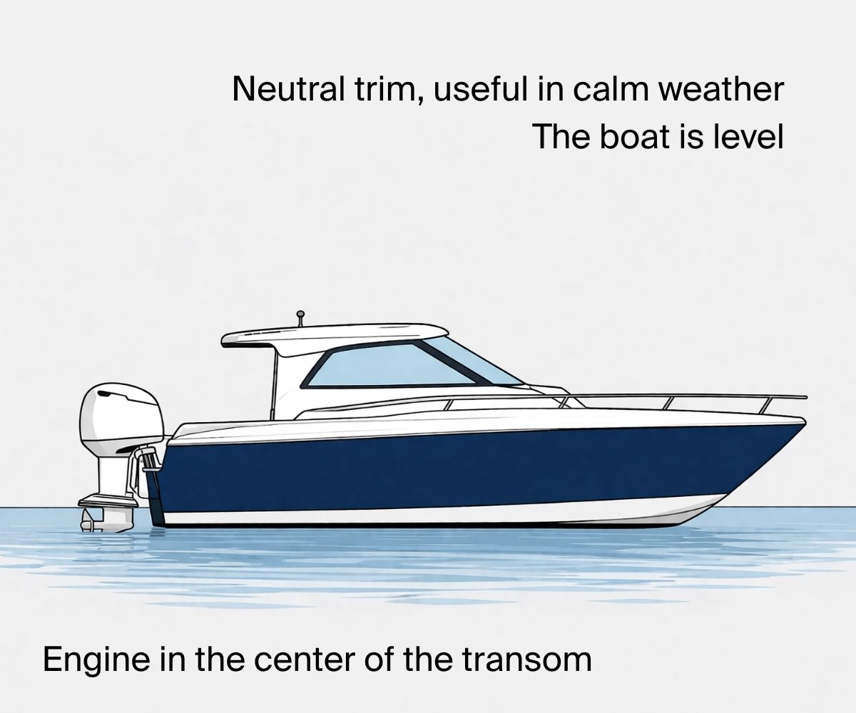 The simplest thing to remember is that trim is always adjusted according to the phase of navigation and the boat’s actual behavior. At startup, the boat is generally helped with rather negative trim. Once the boat is on plane, the trim is gradually brought back toward neutral and then, if conditions allow, toward a slight positive trim to improve glide. As soon as the boat becomes too bow-high, loses stability or the propeller starts to ventilate, the trim should be lowered a little.