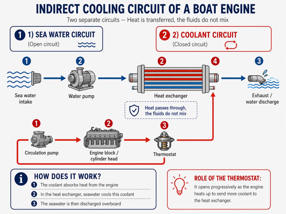 In indirect cooling, the engine does not receive outside water directly into its main galleries. It operates with a closed circuit containing coolant, like a car engine. This fluid circulates through the engine, absorbs the heat, then passes through a heat exchanger. That is where outside water comes into play: it cools the fluid without coming into contact with all the engine’s internal parts.