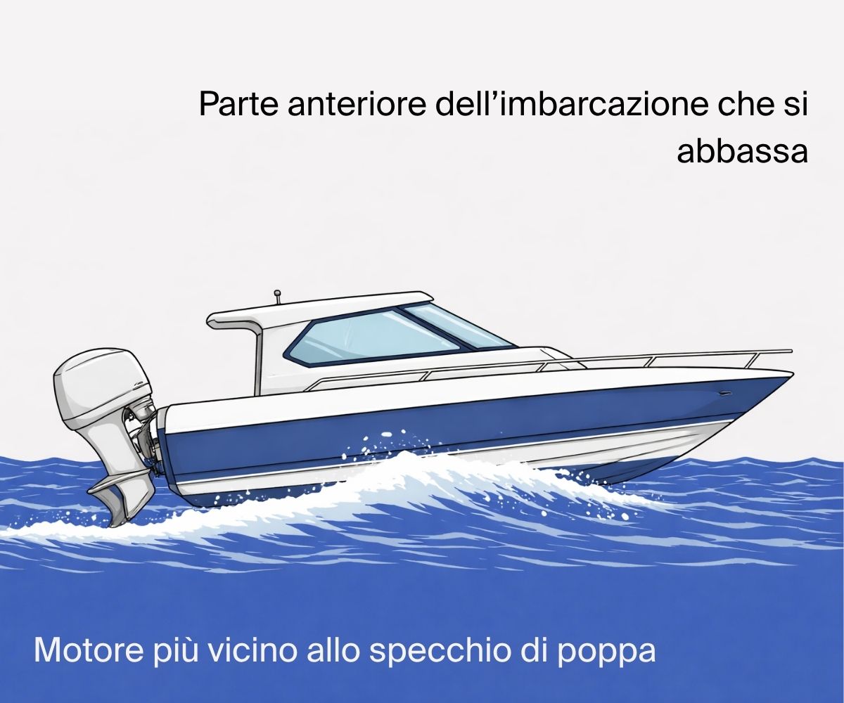 Un trim regolato male si nota spesso abbastanza rapidamente in navigazione. Se la regolazione è troppo negativa, la barca tende a restare troppo incollata all’acqua. La prua può sembrare troppo bassa, lo scafo può spingere più acqua e il motore può sforzarsi più del necessario. Comfort e rendimento ne risentono.