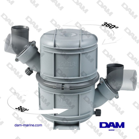 Le nostre camere d'acqua NLP sono realizzate in due stadi, con camere superiore e inferiore, una piastra divisoria orizzontale e un tubo ascendente al centro. L'installazione dell'impianto di scarico, anche in spazi motore ristretti, è notevolmente semplificata grazie alla camera girevole a 360° e ai raccordi di ingresso e uscita. Per un silenziamento ottimale del rumore di scarico, è possibile utilizzare anche un silenziatore VETUS e un collo d'oca, dopo la marmitta.